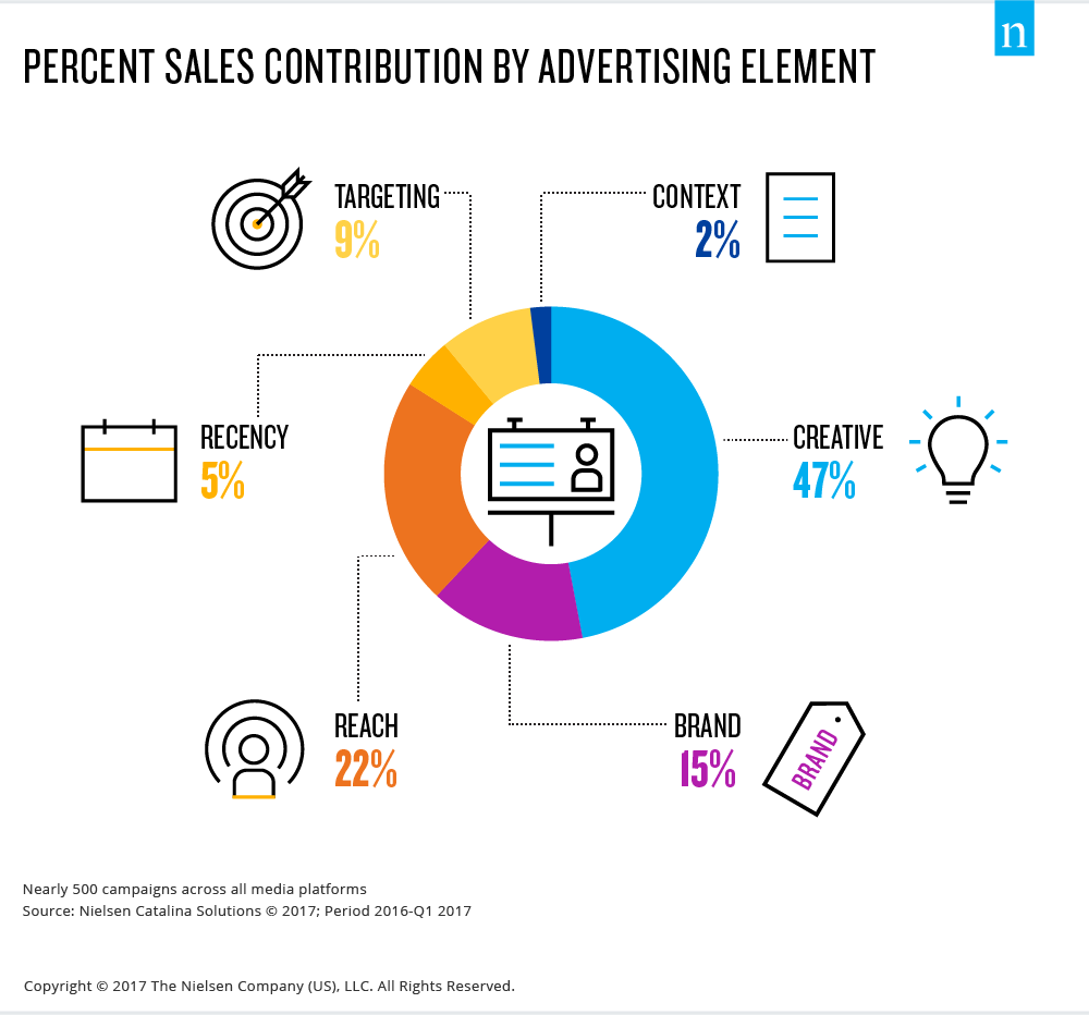 Analisis Nielsen menunjukkan bahwa kualitas kreatif merupakan faktor terbesar dalam efektivitas iklan. Kreativitas berkontribusi hingga 47 persen terhadap peningkatan penjualan.
